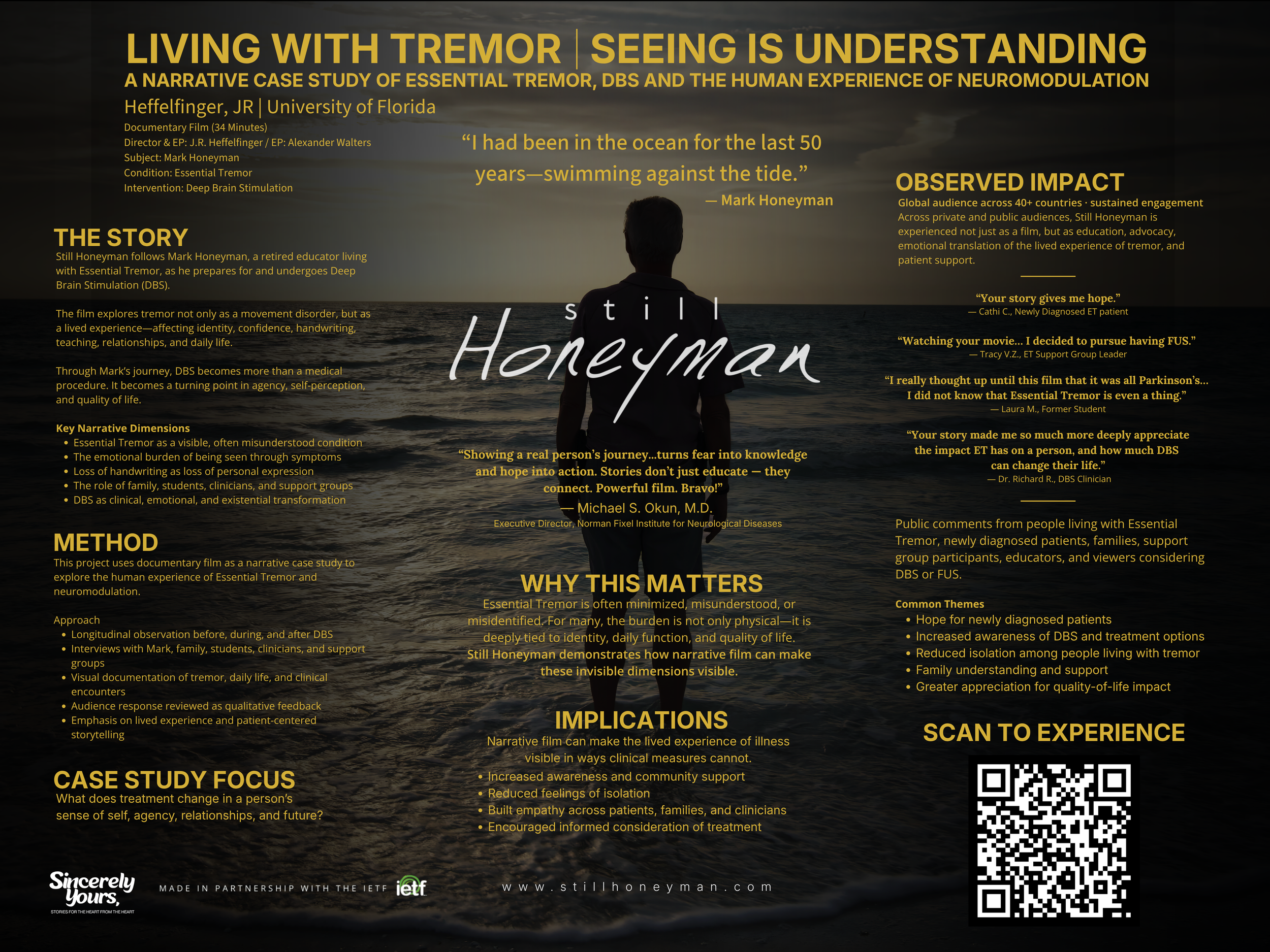 Still Honeyman approaches this challenge through documentary film—offering a narrative case study of Essential Tremor and DBS that brings the lived experience of the condition into view. By translating clinical concepts into human experience, the project supports more informed, empathetic, and personalized approaches to care.